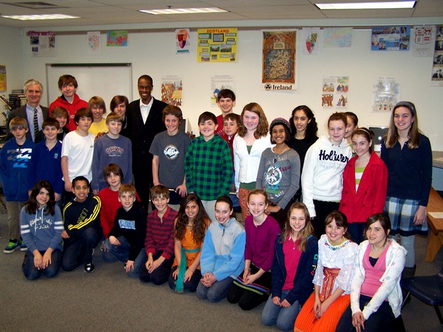 Ib poses with students and staff at Harford Day School in Maryland after speaking to 6, 7 and 8 graders in celebration of International Day in 2010.